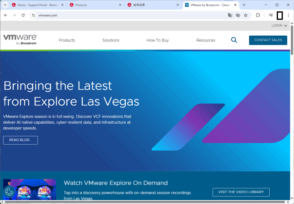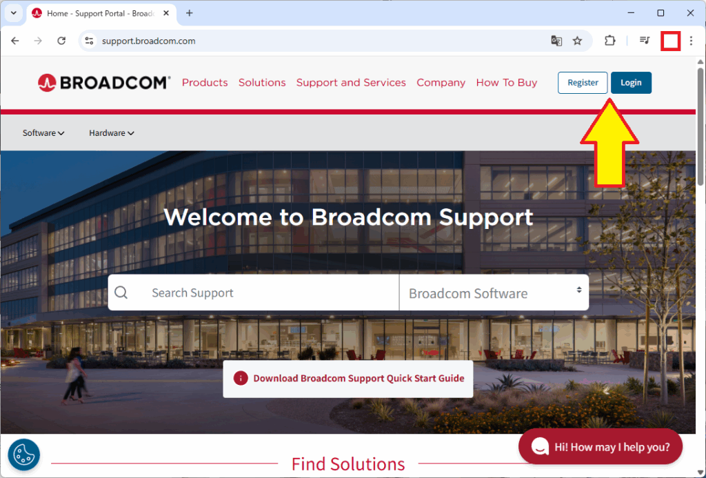 WebブラウザでBroadcom Support Portalページを開き、画面右上の「Login」か「Register」をクリック