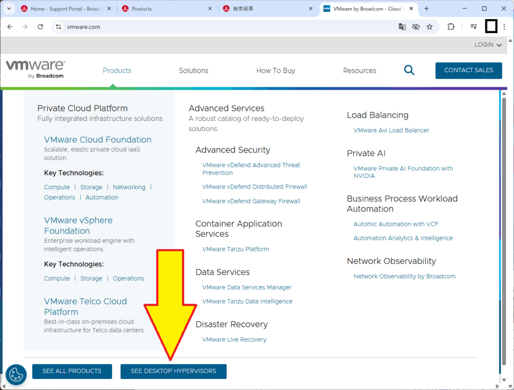 上部のProductsから「SEE DESKTOP HYPERVISORS」をクリックします。