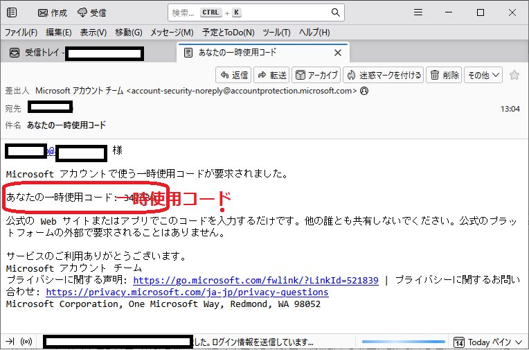 サインイン時に入力したメールアドレスに一時使用コードが届きます。