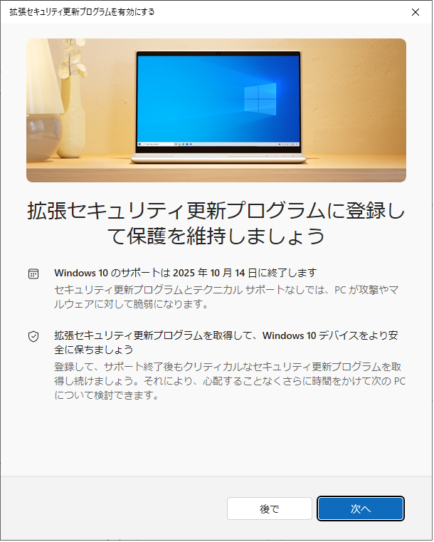 それがWindows10拡張セキュリティ更新プログラム(Extended Security Update:ESU)です。
