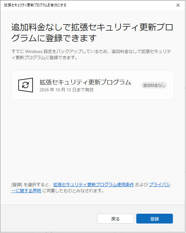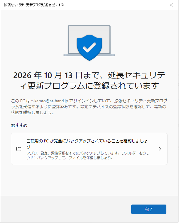 ▲ これで延長セキュリティ更新プログラムに登録できました。